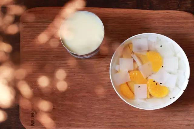 4、凝固的奶凍用刀斜著劃成菱形,加糖水、罐頭橘子和黃桃、芝麻、楊梅干、葡萄干,冷藏后食用。