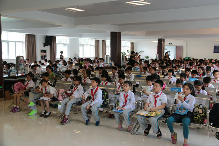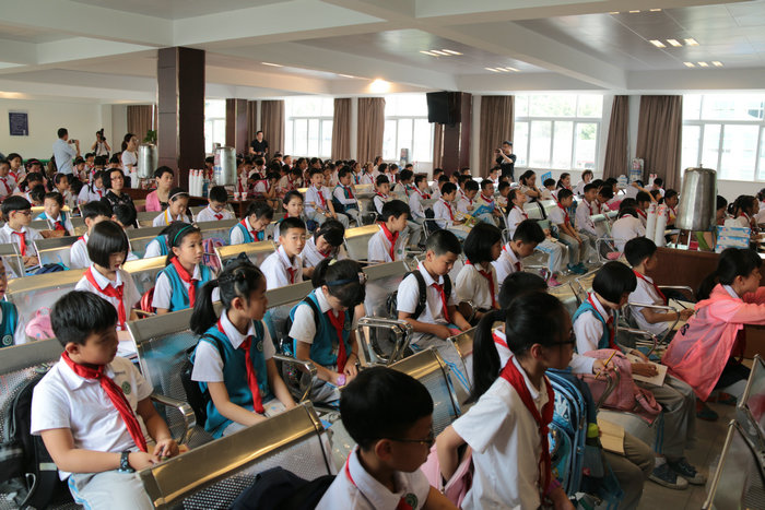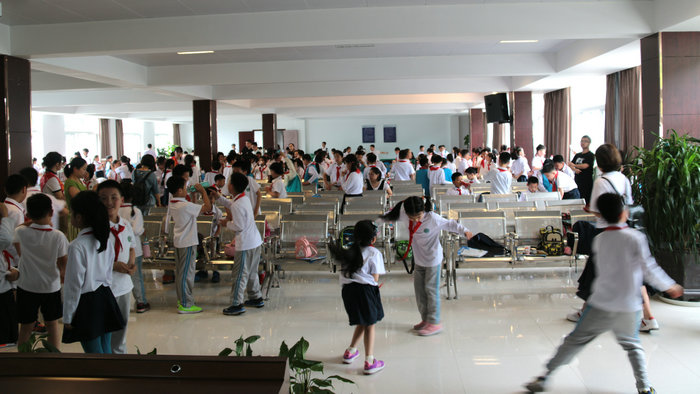 最先到達大廳的三年級一班學生在老師的安排下整齊排著隊,向B幢三樓多功能廳出發(fā)。