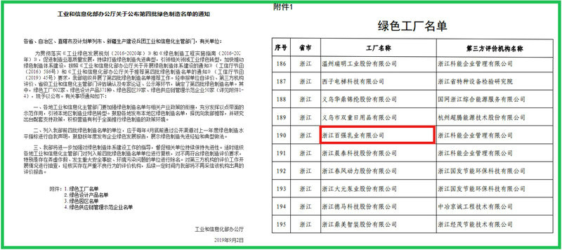 912,國家工業和信息化部在網上公布了第四批綠色制造名單,浙江百強乳業有限公司榜上有名,順利躋身國家綠色工廠序列。