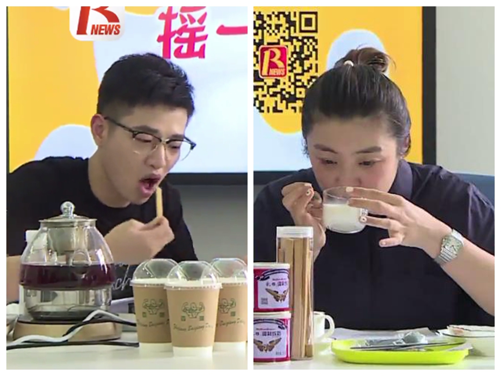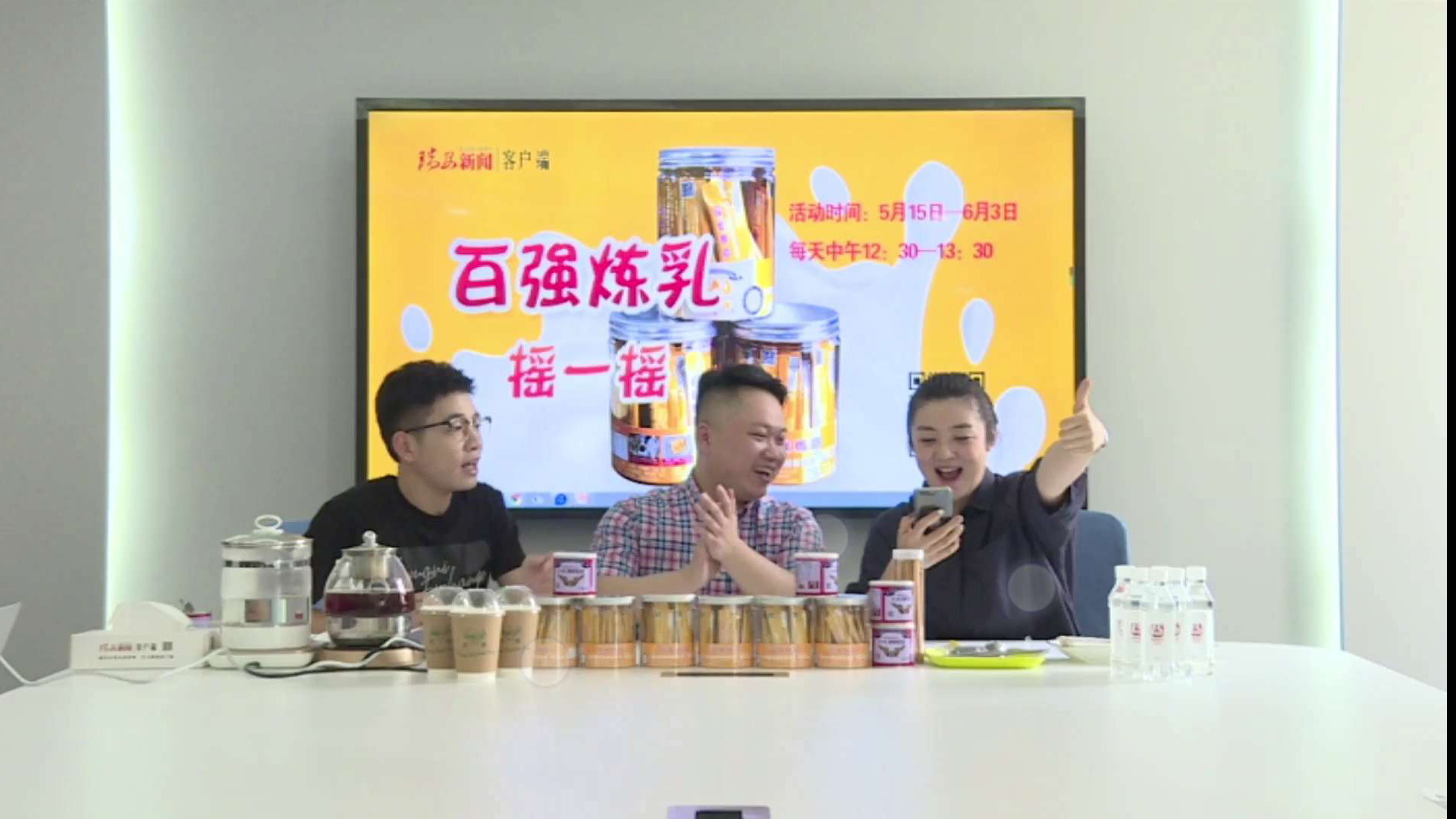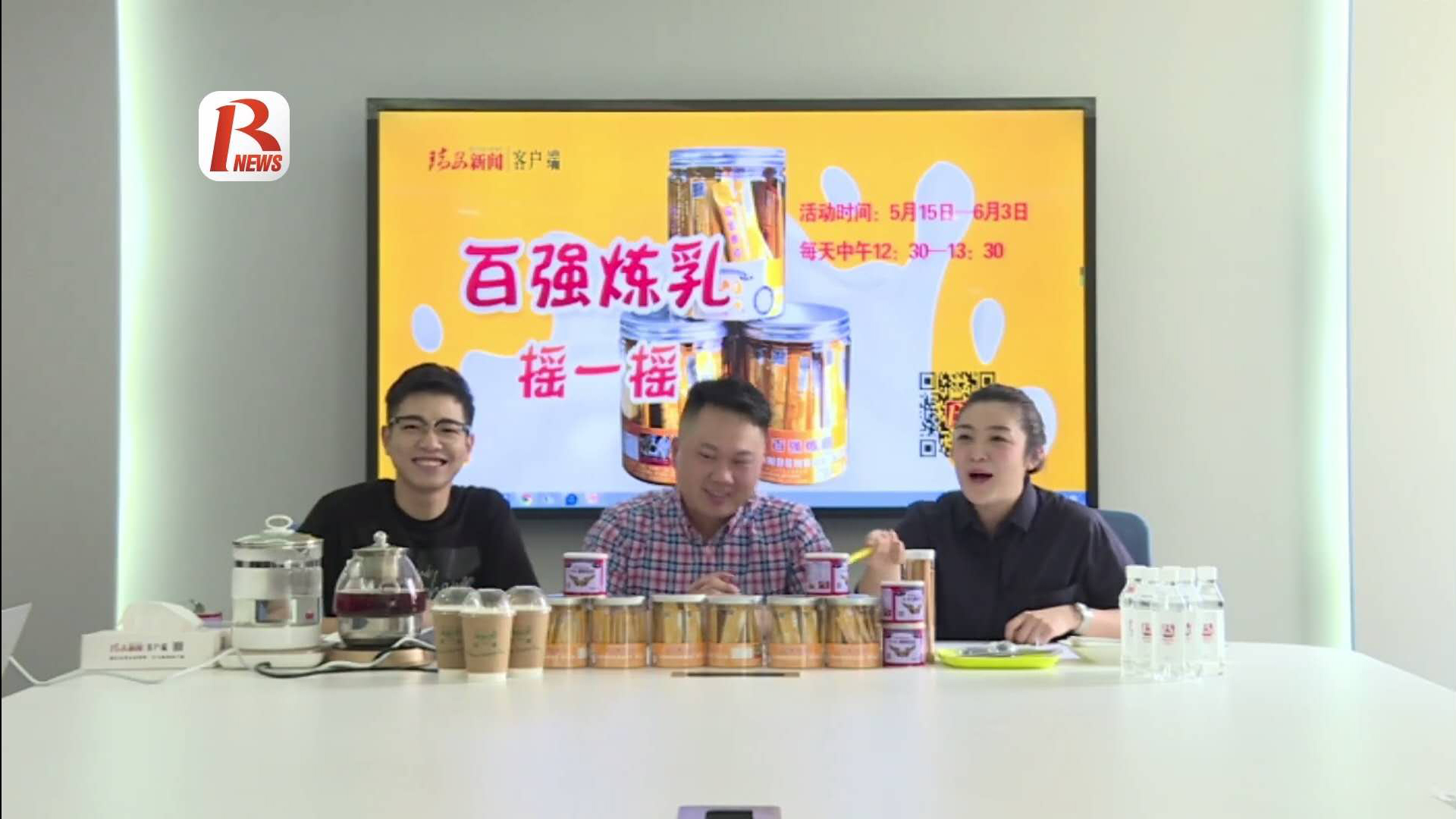 5月15日中午,瑞安新聞APP直播間“搖一搖”節(jié)目推出浙江百強(qiáng)乳業(yè)有限公司產(chǎn)品。百強(qiáng)公司車間主任吳建文帶著百強(qiáng)煉乳進(jìn)入直播間,與海隆、田歡兩名主播互動直播。