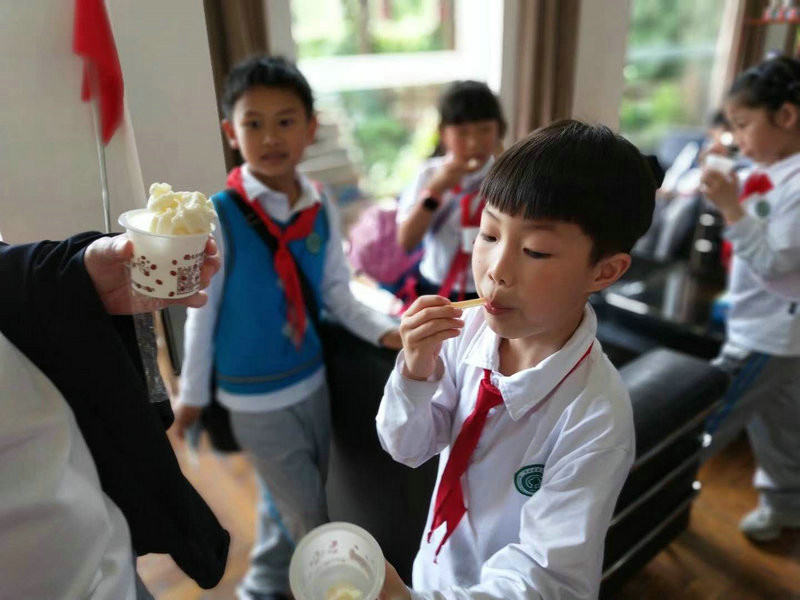小朋友們先來到三樓多功能廳,在學校徐老師主持下拉開活動的序幕。大家看了百強宣傳片,聽了關于企業發展概況、煉乳的起源和制造知識。小朋友們很認真喲,做著筆記呢。當技術員在現場用酒精做“新鮮奶及過期奶”檢驗時,同學們一個個躍躍欲試,爭著要看結果。
