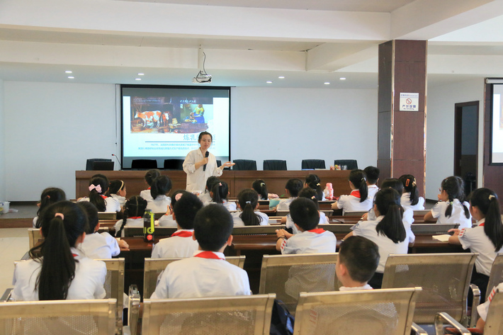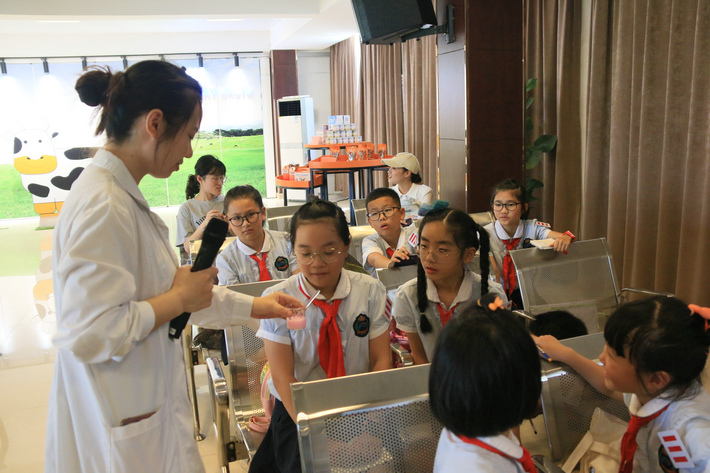 在三樓多功能廳,工作人員向同學們介紹了百強乳業(yè)企業(yè)文化、牛奶和煉乳產品品類、營養(yǎng)價值及應該注意的食品安全問題,并現場演示煉乳檢測酸度的小試驗。