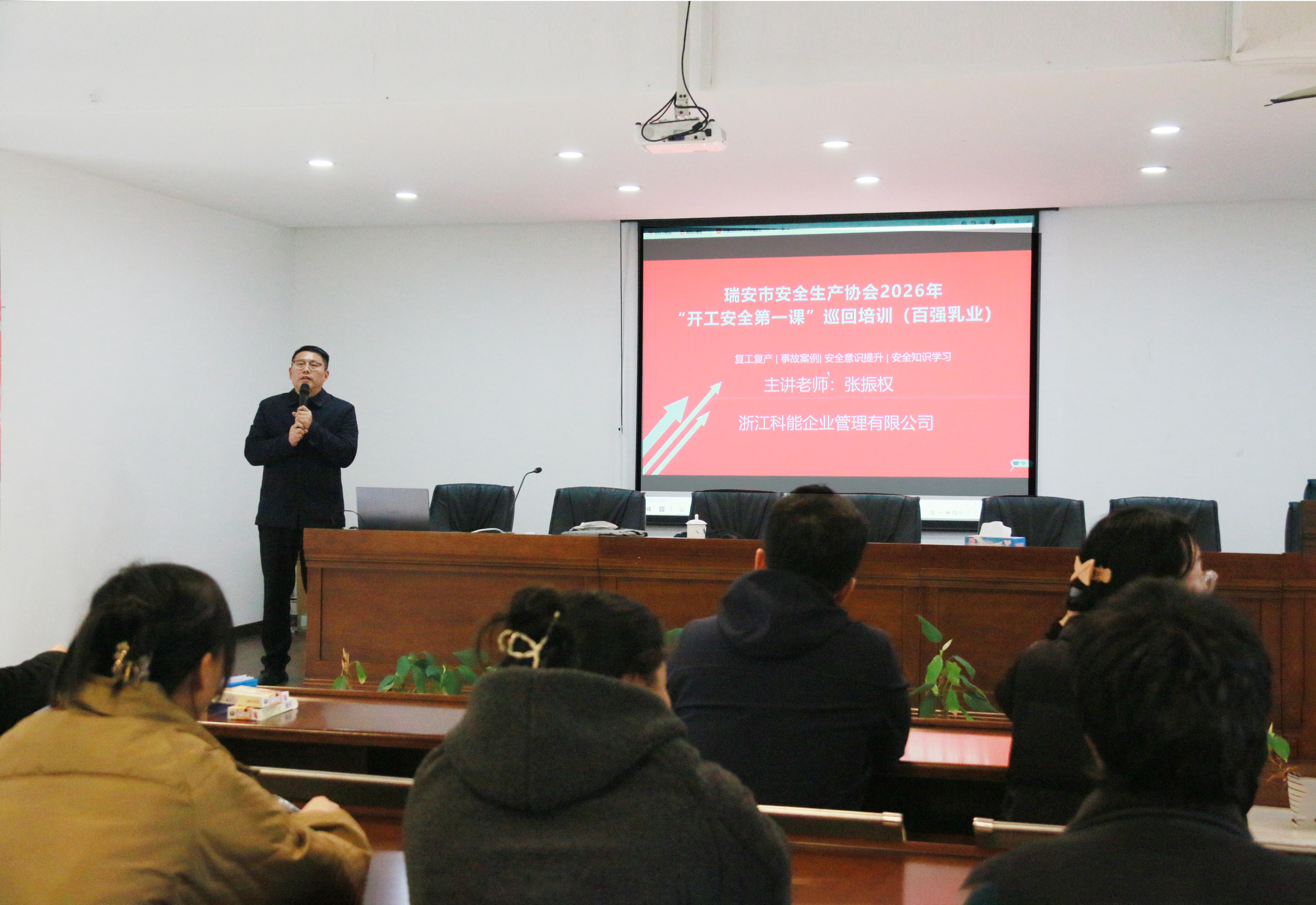 為了強化員工安全生產(chǎn)意識,確保企業(yè)全年安全生產(chǎn)工作開好局、起好步,2026年3月5日,浙江百強乳業(yè)有限公司組織全體員工開展"開工安全第一課"專題培訓。本次培訓是瑞安市安全生產(chǎn)協(xié)會2026年"開工安全第一課"巡回培訓的分會場之一,特聘浙江科能企業(yè)管理有限公司專業(yè)培訓師張振權(quán)進行授課。